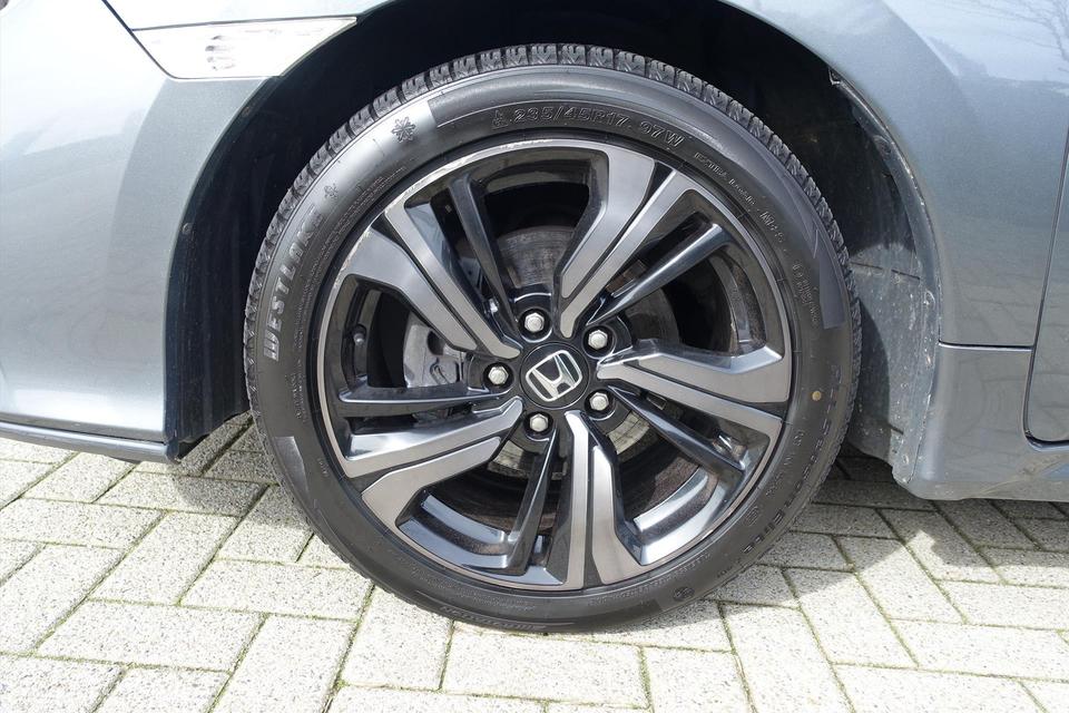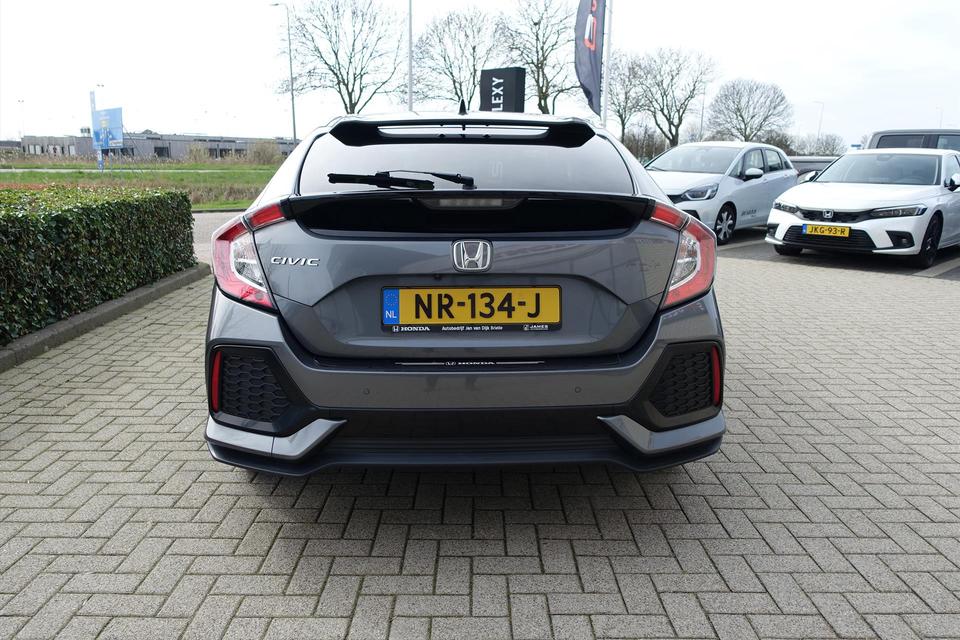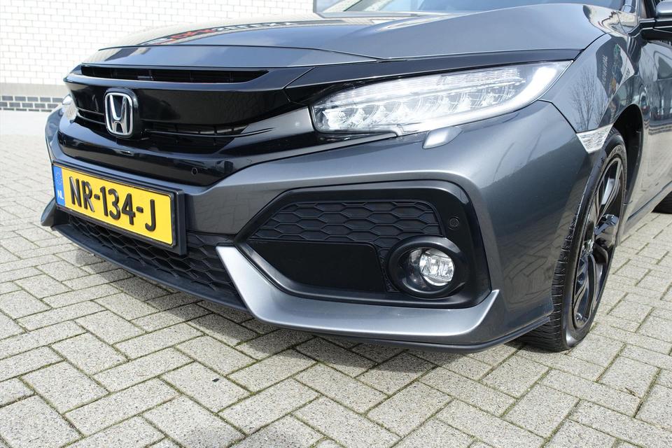 Zoals u mag verwachten van deze Honda Civic is hij uitgerust met een reeks aan actieve veiligheidssystemen. De actuele snelheidslimiet, een inhaalverbod en andere verkeersborden; de verkeersborddetectie ondersteunt u tijdens elke rit. Actieve dodehoekdetectie waarschuwt als een ander voertuig zich in uw dode hoek bevindt. Dit verkleint de kans op een aanrijding. Het risico van een kop-staartbotsing wordt aanzienlijk verminderd door de forward collision warning. De veiligheid van deze auto wordt verder verhoogd door hill start assist, rem-assistent en bandenspanningcontrolesysteem.